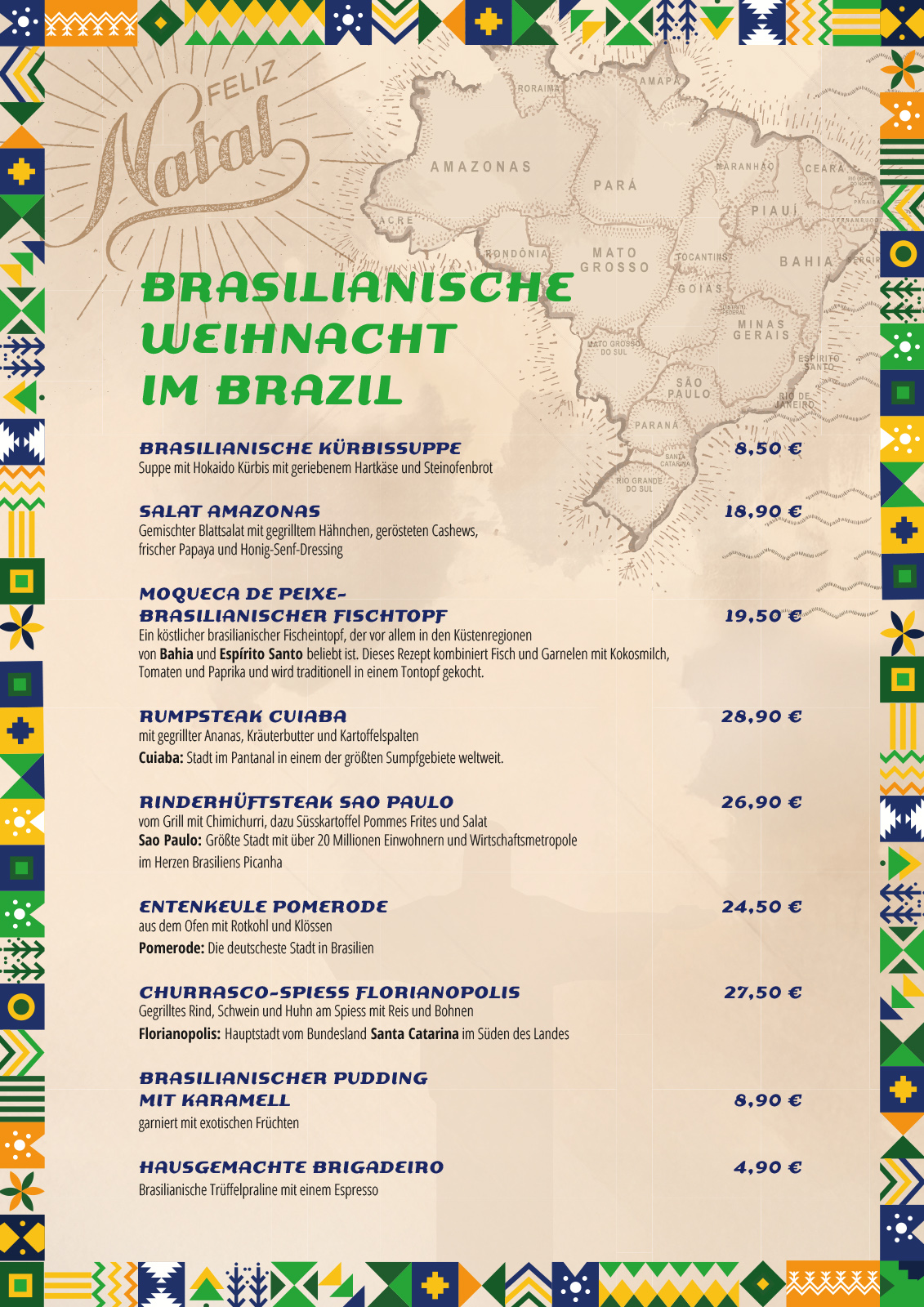 Südamerikanische Rhythmen – feurig wie der Karneval in Rio de Janeiro oder smooth wie die Wellen an der Copacabana – es duftet nach frischem Kaffee und nach exotischen Köstlichkeiten, Sie sitzen auf unserer Sonnenterrasse und schlürfen einen fruchtigen Cocktail, genießen einen Kaffee an der Bar, verwöhnen Ihren Gaumen mit kulinarischen Spezialitäten des lateinamerikanischen Kontinents oder rauchen gemütlich eine Zigarre. Egal, ob mit Freunden bei einem Gespräch, bei einem Rendezvous oder allein, im Brazil können Sie sich vom „l’ ambiente hispanoamericano“ beflügeln lassen. Und das mitten im Herzen der Stadt Chemnitz.